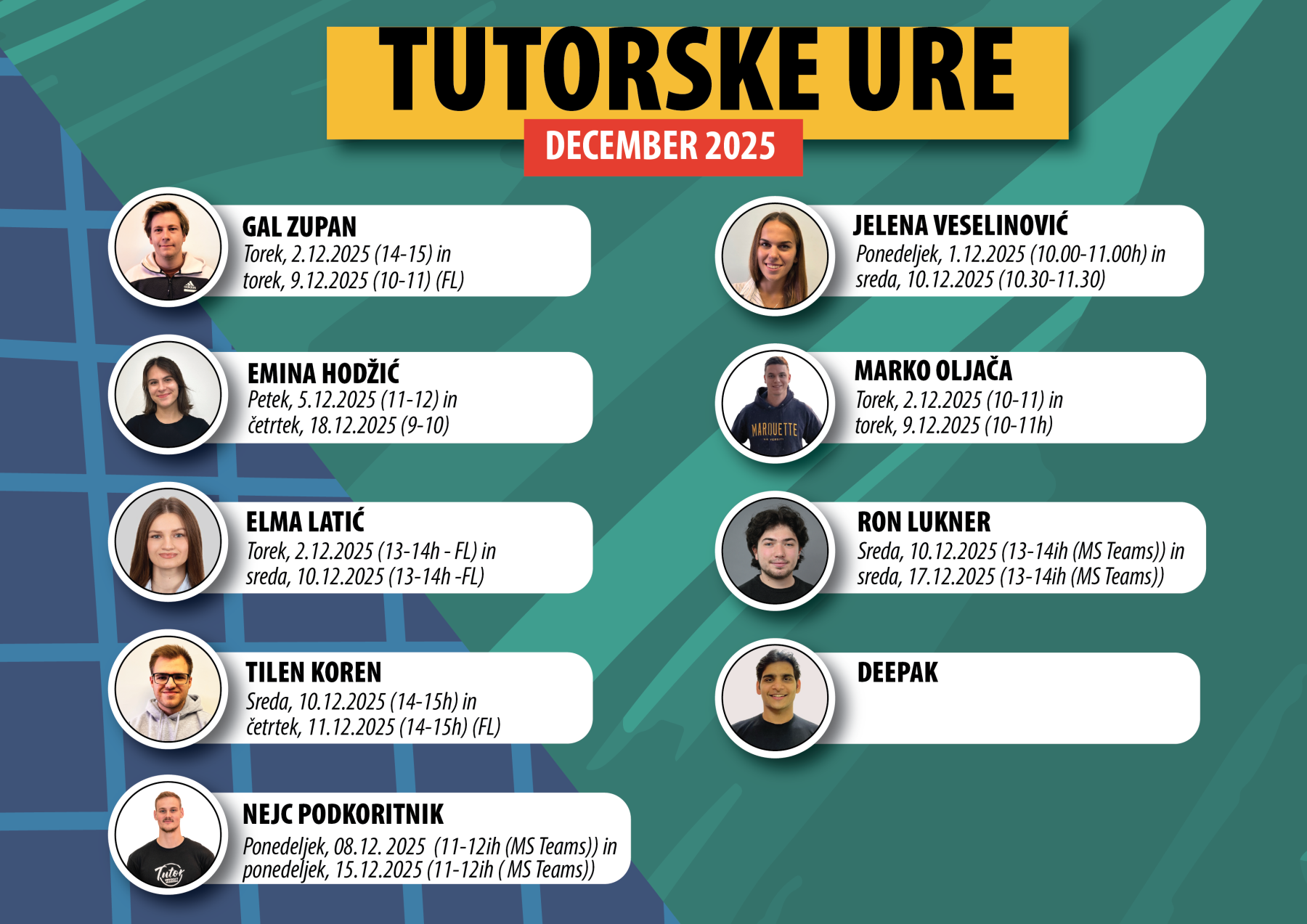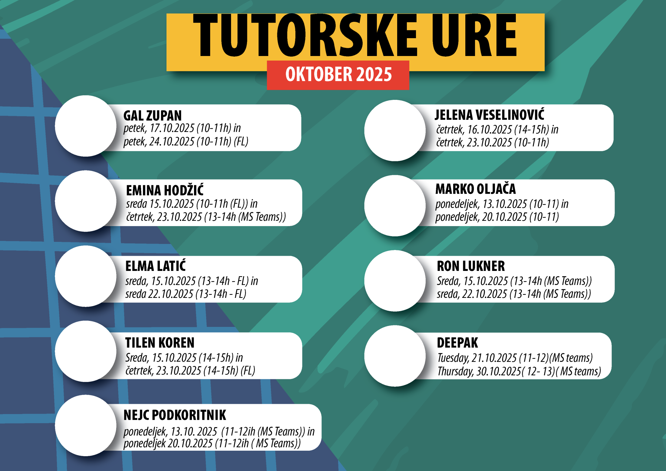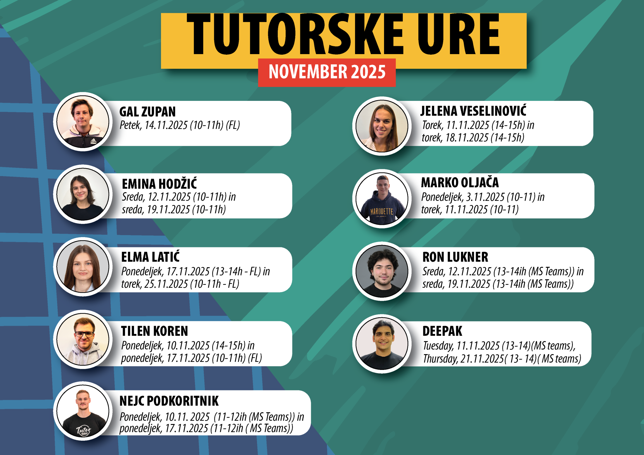 Tutorji so študenti višjih letnikov in zaposleni na fakulteti, ki so pripravljeni pomagati pri reševanju akademskih, organizacijskih in osebnih vprašanj.