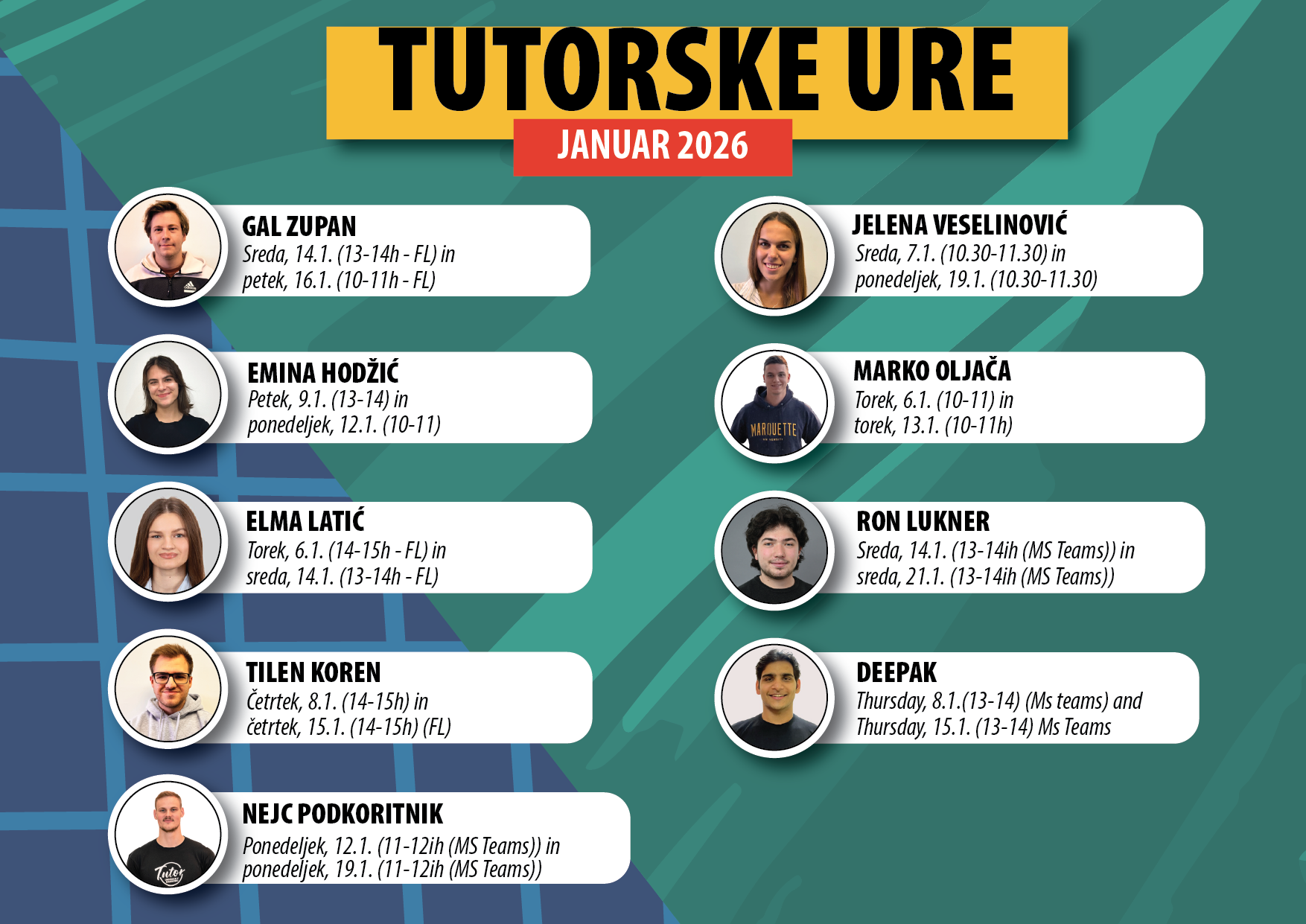 Tutorji so študenti višjih letnikov in zaposleni na fakulteti, ki so pripravljeni pomagati pri reševanju akademskih, organizacijskih in osebnih vprašanj.